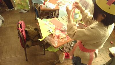 本日、図工で「わっかでへんしん」の学習を行いました。輪っかに飾り付けをしてみんな変身しました。