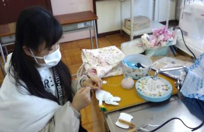 自分の作りたいものを手で縫ったり、ミシンを使って縫ったりしています。主に、巾着や小物入れを作っています。クッションやマスコットを作っている人もいます。手芸クラブの良いところは、集中して楽しく自由に作品が作れるところです。