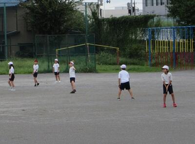 ティーボールは野球型の球技です。まずはみんなでキャッチボール。